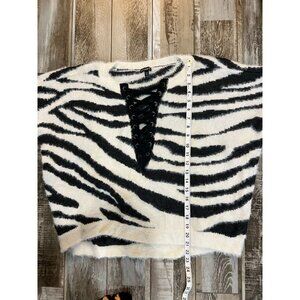 Express Zebra Faux Fur Sweater Womens Size, Oversized Boxy Lace Up V Neck Ivory . Black