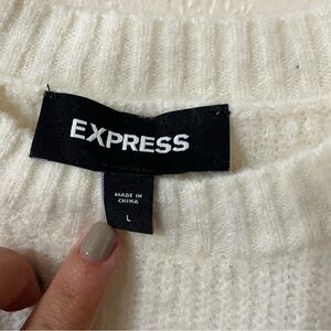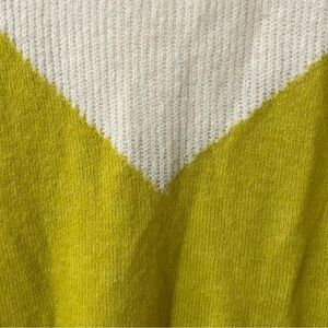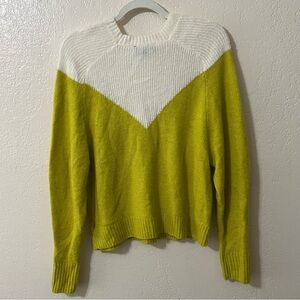 Gorgeous and cozy Express sweater in a bold lime green and white colorblock design. Features a flattering chevron-style pattern across the chest and a classic crew neckline. The fabric feels incredibly soft—like cashmere—but it’s not! Perfect for layering or wearing solo for a pop of color.