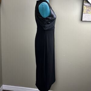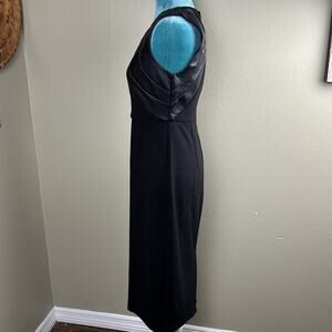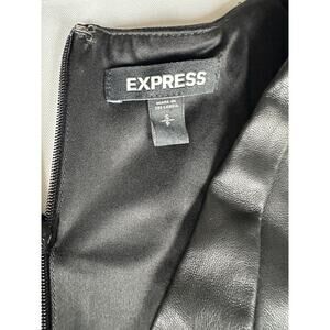 Express women Small sheath fit with stretch midi dress in BLACk with black vegan leather accented top. Empire waist type fit flattering ! See measurement pictures - zippered . Thank you so much for your consideration of this excellent condition Expresse unique flattering dress!