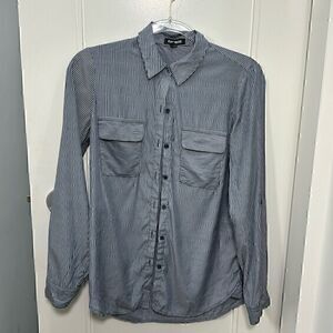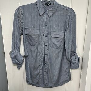 Express Women Shirt Navy White Vertical Striped Button Up Roll Sleeve Size XS TP