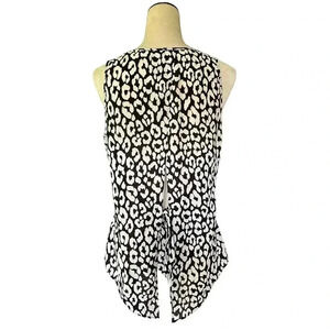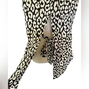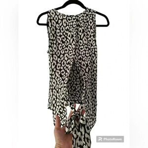 Black, white, and pink details on top as shown in picture. Loose top, v-neck in front and v-opening in the back. Ties up in the back with a bow. Very chic and casual, perfect for summer. Has been worn but is in excellent condition.