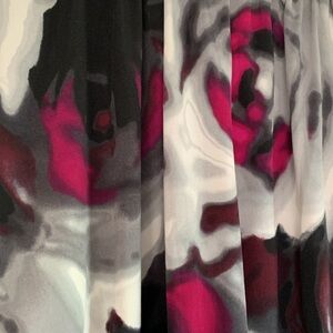 Chic blouse with abstract print. Features black, gray, and pink tones. Stylish and versatile.