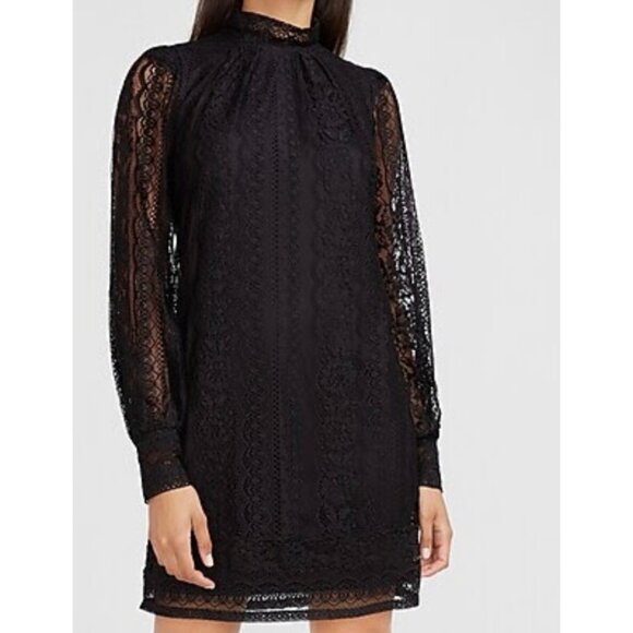 Express Women’s Black Long Sleeve High Neck Lace Dress Size M
