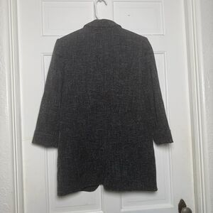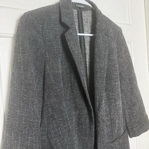 Classic and versatile blazer from Express. Longline style with open front, 3/4 sleeves, and subtle black metallic threading throughout. Lightweight yet structured, perfect for work, night out, or layering over dresses.