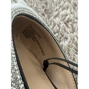 The product is a new pair of Express Women's Black Mules Flats in size 6, featuring a pointed toe shape, low block heel, and bow detail accent. The shoes are made of textile material and have a stylish mule design. The black color and metal theme add a touch of elegance to the overall look, making them a versatile and fashionable choice for any woman's wardrobe.