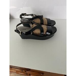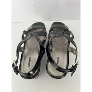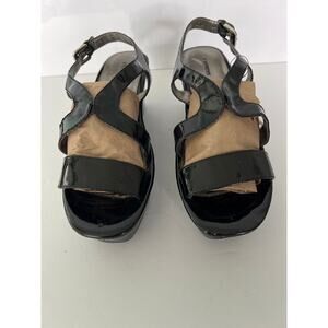 Express Women’s Black Patent Platform Sandals Size 9. Adjustable back Strap with metal buckle, heel 3”, front 1.5”