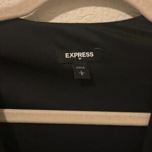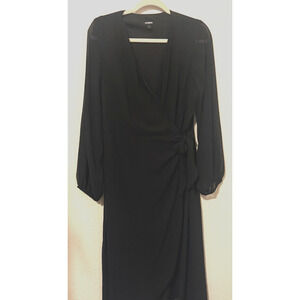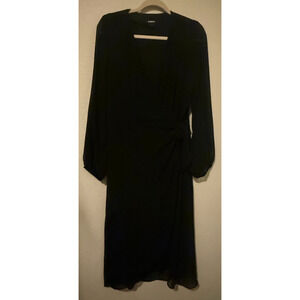 This classic Express black wrap-style dress combines sophistication and comfort in one timeless silhouette. Designed with a flattering V-neckline, adjustable tie waist, and long semi-sheer sleeves, it transitions effortlessly from work to evening events.