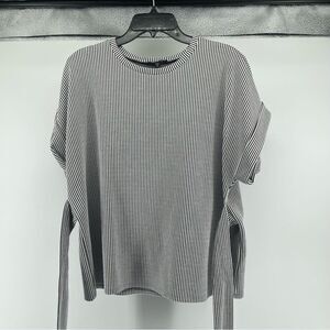 Crewneck. Dolman short sleeves. Pullover. Soft. Attached tie on sides; can be tied in front or back (see pictures). Textured corded stripes. Medium weight. Oversized. Polyester/Viscose/Spandex