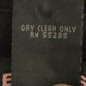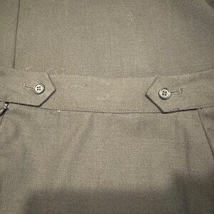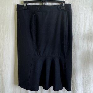 This is an Express women's pencil skirt in black, made of a wool blend (96% wool, 4% spandex) material. It is a size 4 with a solid pattern and features accents like a small ruffle at the bottom of the back (please see photos), buttons, and a zipper closure. The skirt is knee-length, straight-cut, and lined, suitable for various occasions including travel, parties, casual wear, and work/business settings. It is designed for all seasons, requiring dry clean only.