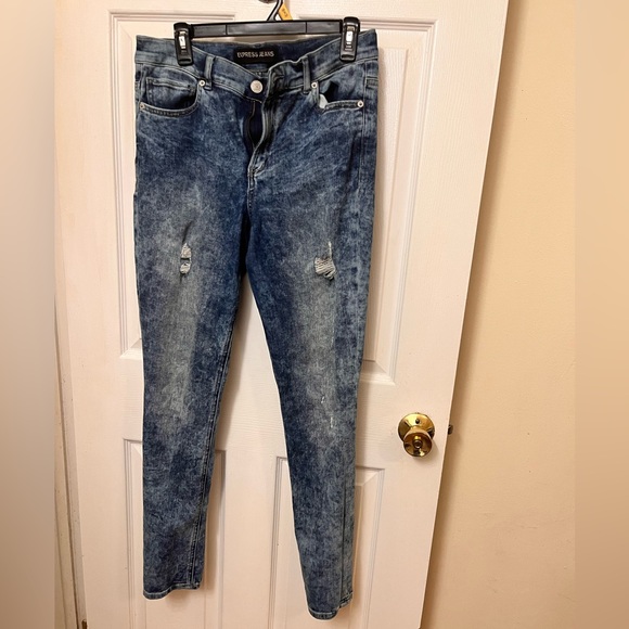 Stylish blue high rise Jegging with a distressed look. Perfect for a trendy casual outfit.