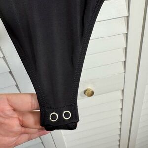 Buttery soft capsule wardrobe must - black bodysuit with drape neck.
