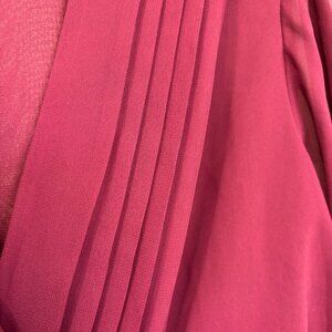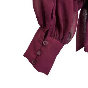 This burgundy wrap blouse by Express offers a stylish and feminine look. The sheer fabric and tie waist add elegance, while the pleated design and long sleeves provide coverage and flair.