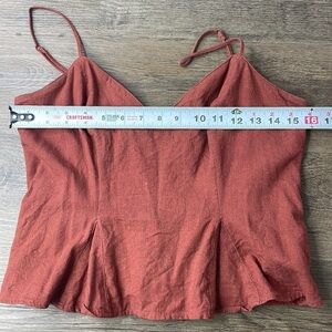 Express Women’s Burnt Orange Spaghetti Strap Cropped V Neck Tank, size M. In good used condition,one little nubby spot on front shown in picture- not very noticeable. See pictures for measurements and fabric content.