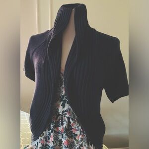 Elegant open-front cardigan. Features ribbed texture. Perfect for layering. Short sleeves ribbed knit sweater. Midnight blue Xs