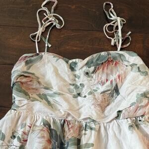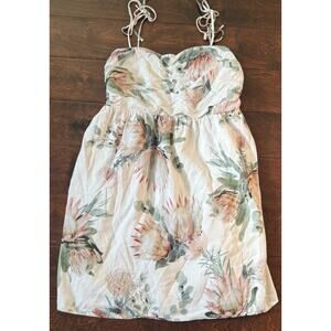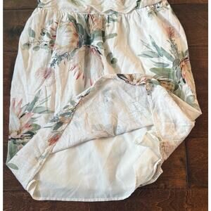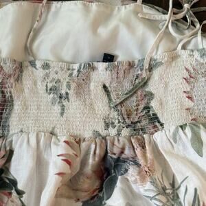 Express women’s dress in size Large. Features a soft cream base with a beautiful floral print in blush, green, and peach tones. Smocked back for comfort and adjustable tie straps. Lined for quality. Made in the Philippines.