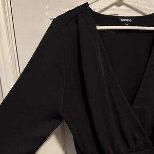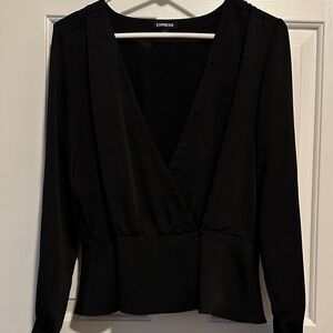 Chic black wrap blouse from Express. Features a deep V-neck and long sleeves. Perfect for stylish occasions.