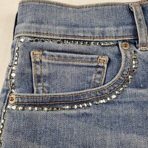 Medium wash denim with all over factory distressing and sandblasting. Shorts feature clear gemstone detailing that lines the silhouette of the short. There are approximately 5 gems that are missing, however, the silver backing that they were glued to is still present, so it's not as noticeable as there isn't a gap in the line. Factory frayed hemline. Zip fly with button closure. Front and back pockets. Size 00