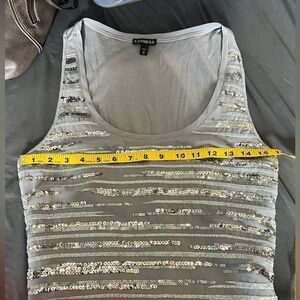 100% polyester gray metallic tank top from Express. Versatile top- pair with cardigan and slacks for work or a skirt and heels for evening.