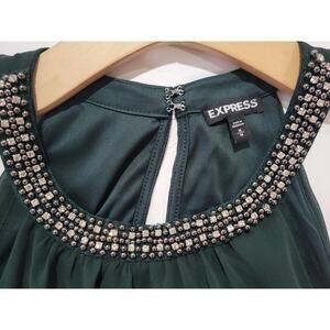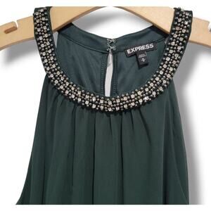 Elegant Express sleeveless halter top in rich hunter green, featuring a beautifully embellished neckline and button-back closure. Made from 100% polyester with a soft, flowy drape and elastic hem for a flattering fit. Perfect for date nights, holidays, or dressy casual looks. Gently used and in excellent condition.