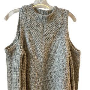 Keywords: Express, women's sweater, medium, gray, pullover, cold shoulder, cable knit, crew neck, fall fashion, casual wear, knit sweater, long sleeve, pre-owned, excellent condition, hand wash.