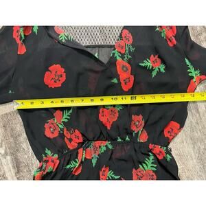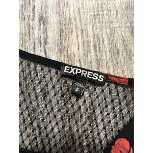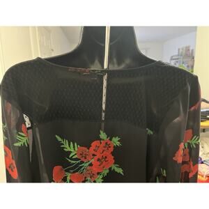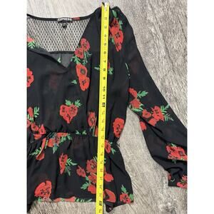 Express Women’s Medium Black Sheer Blouse Red Floral Print Long Sleeve Top