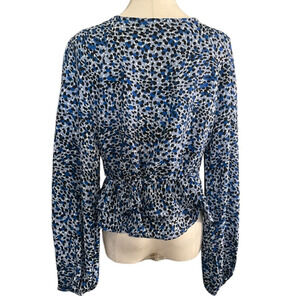 Stylish and eye-catching Express blouse featuring a vibrant blue and black abstract print. This blouse is made from 100% polyester, providing a lightweight and comfortable fit. The design includes a deep V-neck with a twisted front, adding a touch of elegance and sophistication. The long sleeves and cinched waist create a flattering silhouette, making it perfect for both casual and semi-formal occasions.