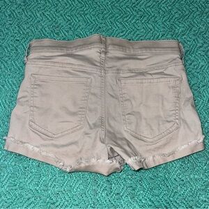 These Express jean shorts in an off white gray hue offer a casual and summery vibe with their cutoff style and frayed hem. Perfect for warm weather, they provide a versatile addition to any wardrobe.