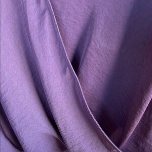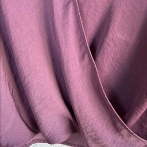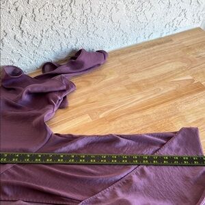 Chic plum blouse with ruffle sleeves. Wrap design for a stylish look. Ideal for versatile wear.