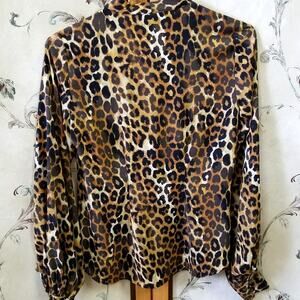 Express Portofino Leopard Print Tie Neck Long Sleeve Button V-Neck Top XS. Layflat measurements: length 25; chest 17; sleeve length (from shoulder seam) 24. Very classy top! The Express Portofino Leopard Print Tie Neck Top features long sleeves and a stylish button front. This chic V-neck blouse is perfect for both casual and dressy occasions. Made from high-quality materials, it offers a flattering fit and a trendy leopard print design.