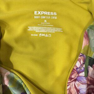 The Express Women's Body Contour Swim Two Piece in size L features a stylish bikini top with a floral pattern and halter strap. Made from nylon and spandex, this multicolor set is perfect for beach outings, with padded features for added comfort. The hand wash only care instructions ensure easy maintenance of this two-piece swimwear, designed by the brand Express for women looking for a sleek and fashionable swim attire.