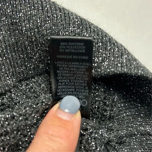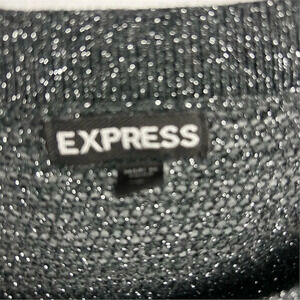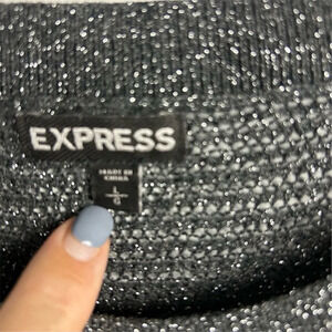Keywords: Express, women's sweater, pullover, gray sweater, metallic finish, size large, 3/4 sleeve, rayon, polyester, hand wash, pre-owned sweater.