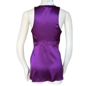 Express purple silk goddess style scoop neck halter tank top with jeweled neckline size medium NWT. New unused/unworn pristine condition. With a mix of simplicity and glamour, the purple jeweled neckline draws the eye upward while the cut-in sleeveless style highlights the shoulders. This elevated tank top also features a pleated bust, jewel embellished empire waist, side zip closure, and relaxed fit. This top is perfect for a holiday gathering or weekend ready when paired with your favorite jeans.