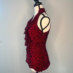 Express Women's Razor Back Halter Top Blouse, Deep Red & Black Leopard Print, XS