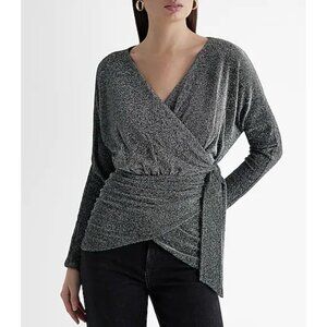 Express Women's Relaxed Metallic V-Neck Surplice Tie Waist Top – Pitch Black/Silver – Size S – NWT – MSRP $68