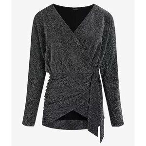 ✨ Shine effortlessly! This Express surplice top features a flattering wrap-front design, shimmering metallic fabric, and a chic tie waist — ideal for dressing up jeans or elevating your night-out look.