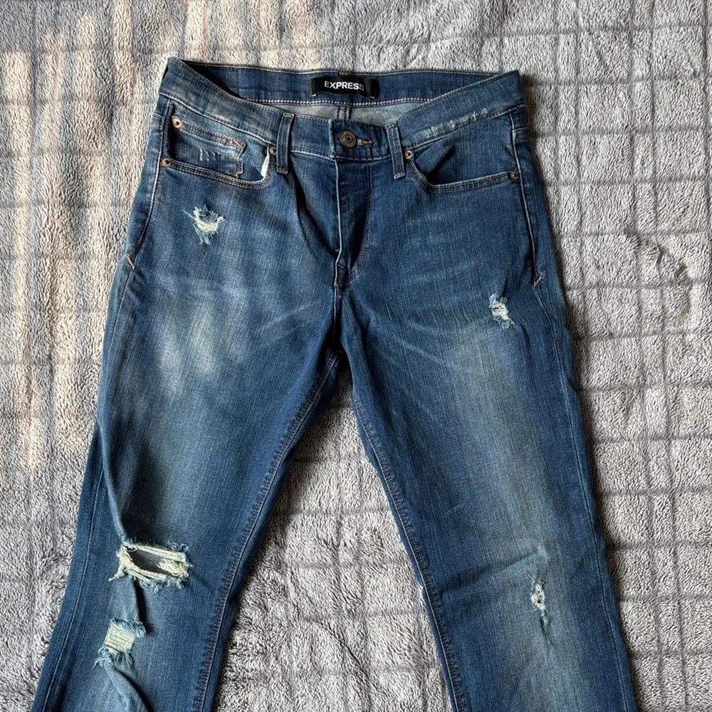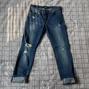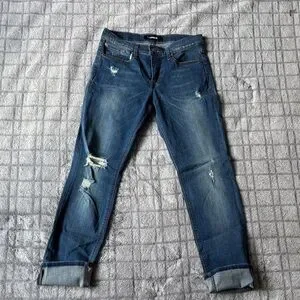 Chic and edgy design. Ripped details for a modern look. Classic blue denim for versatile styling. Wear with crop or without. Like new.