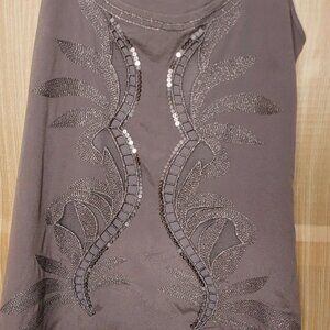 Women’s Express Silver sparkle razorback tank top. Has beautiful sequin and embroidery detail. There is a lining panel under front. Like new condition! Measurements are: 16” from armpit to armpit, 16” from armpit to hem, and 24” from shoulder to hem.