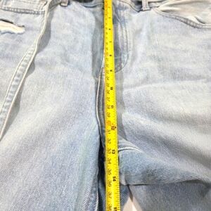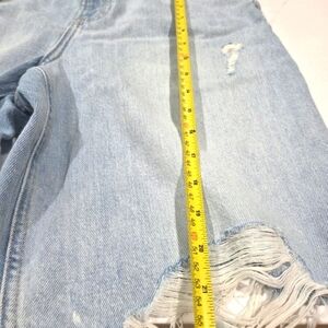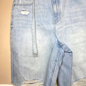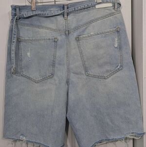 Stylish light blue denim shorts with a distressed design. Features a frayed hem and a matching belt.