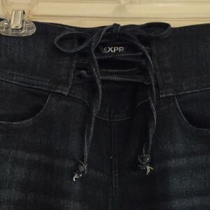 Express lace up front, side zip, wide band, women's size 10 regular, high waist stretch jean jegging, dark wash, 30 inch inseam, excellent condition