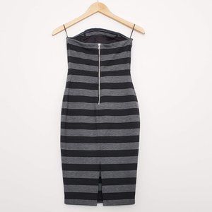 Express Striped Stretch Knit Tube Dress. Flattering black and grey striped strapless tube dress. Curves built into the cut of the dress to allow for natural curves without visibly overstretching the fabric. Back center zipper and center slit at bottom of dress. Plastic strip at the to for support holding up the dress. Fabric hooks for straps are built into the inside lining, optional straps not included.