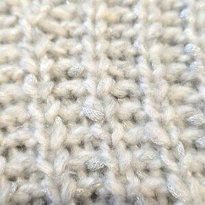 Light grey blue with silver metallic threading in the chunky weave. Under certain lighting, it appears bluish and under others looks grey.