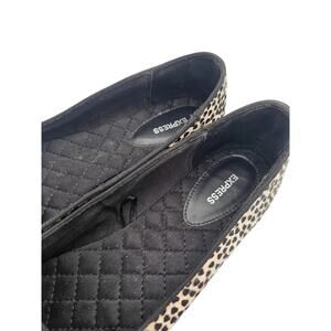 Step out in style with these adorable Express ballet flats! These size 9 shoes feature a pointed toe design and a unique calf hair texture in a chic black and cream color combination. The playful heart pattern adds a touch of whimsy to any outfit. Perfect for adding a fun and fashionable twist to your everyday look! Don't miss out, grab them today!\n\nWomens size 9\nPointed Toe\nBallet Flats\nCalf Hair \nBlack and Cream Hearts
