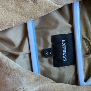 Stylish tan leather jacket by Express. Features zippered pockets and classic design.