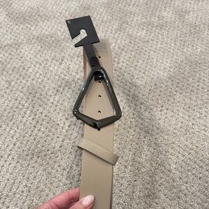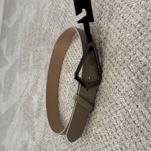 Stylish taupe belt with a unique black geometric buckle. Perfect for any outfit.
