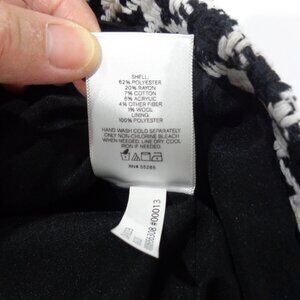 This Express women's blazer jacket in size XS is made of a polyester blend tweed fabric with a black and white plaid pattern. It features a collarless design with raw edge accents, long sleeves, and an open front one button closure. Suitable for various occasions from casual to formal, this mid-length jacket is lined with polyester and is ideal for winter, fall, and spring wear.