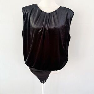 Velvet material. Sleeveless snap bodysuit. Has shoulder pads. Open wrap back with single button. No known flaws