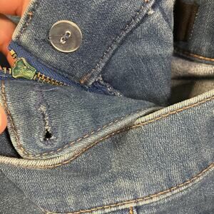 * Mid-rise, medium blue wash, faux pockets, wide leg with flare, decorative buttons, side zip closure with interior button, cotton blend, stretch