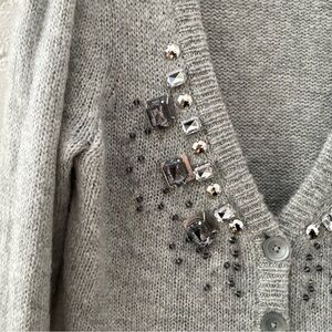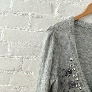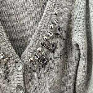Express Bling Button Front V Neck Wool Blend Cardigan Sweater Long Puff Sleeve with front slip pockets. Chunky Rhinestone embellishment and subtle sparkle to fabric.