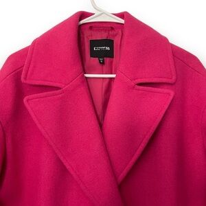 Features: Pea coat style, double breasted, large black buttons, notched collar, two slip pockets on front, and fully lined. Extra buttons inside pocket. Gorgeous jacket. Model is wearing same style jacket in another shade of pink.