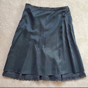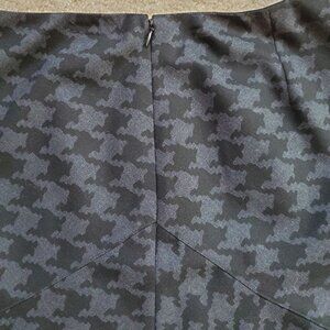 Express wool skirt. 100% wool fabric with dark grey and black squired patterns. Unique asymmetrical cut with ruffle and delicate black lace along the hem. Zipper and hook-and-bar side closure. Lined. Pre-owned, excellent condition. Hip waist: 32 in, Zipper: 7 in, Length: 25 in.